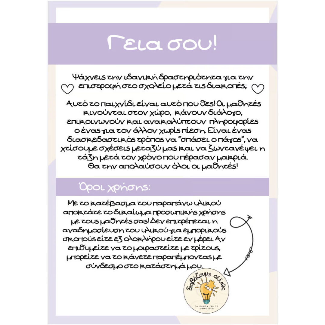 📝 Το κάθε παιδί έχει μπροστά του ένα φύλλο με προτάσεις και προσπαθεί να τις συμπληρώσει, βρίσκοντας συμμαθητές που ταιριάζουν σε κάθε μία.