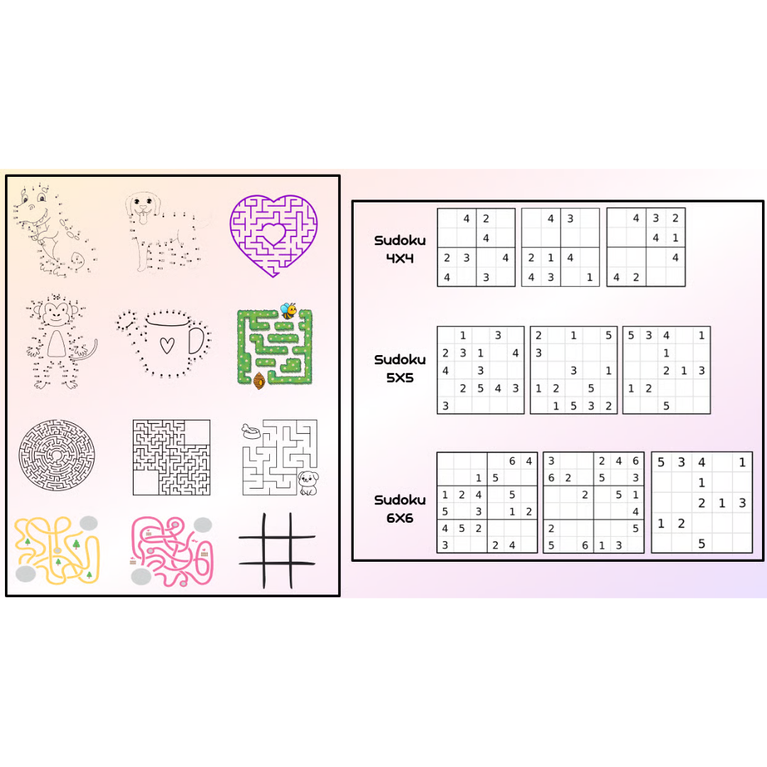 - Sudoku 4×4, 5×5, 6×6, λαβύρινθοι, «Βρες τις διαφορές», μοτίβα κ.ά.